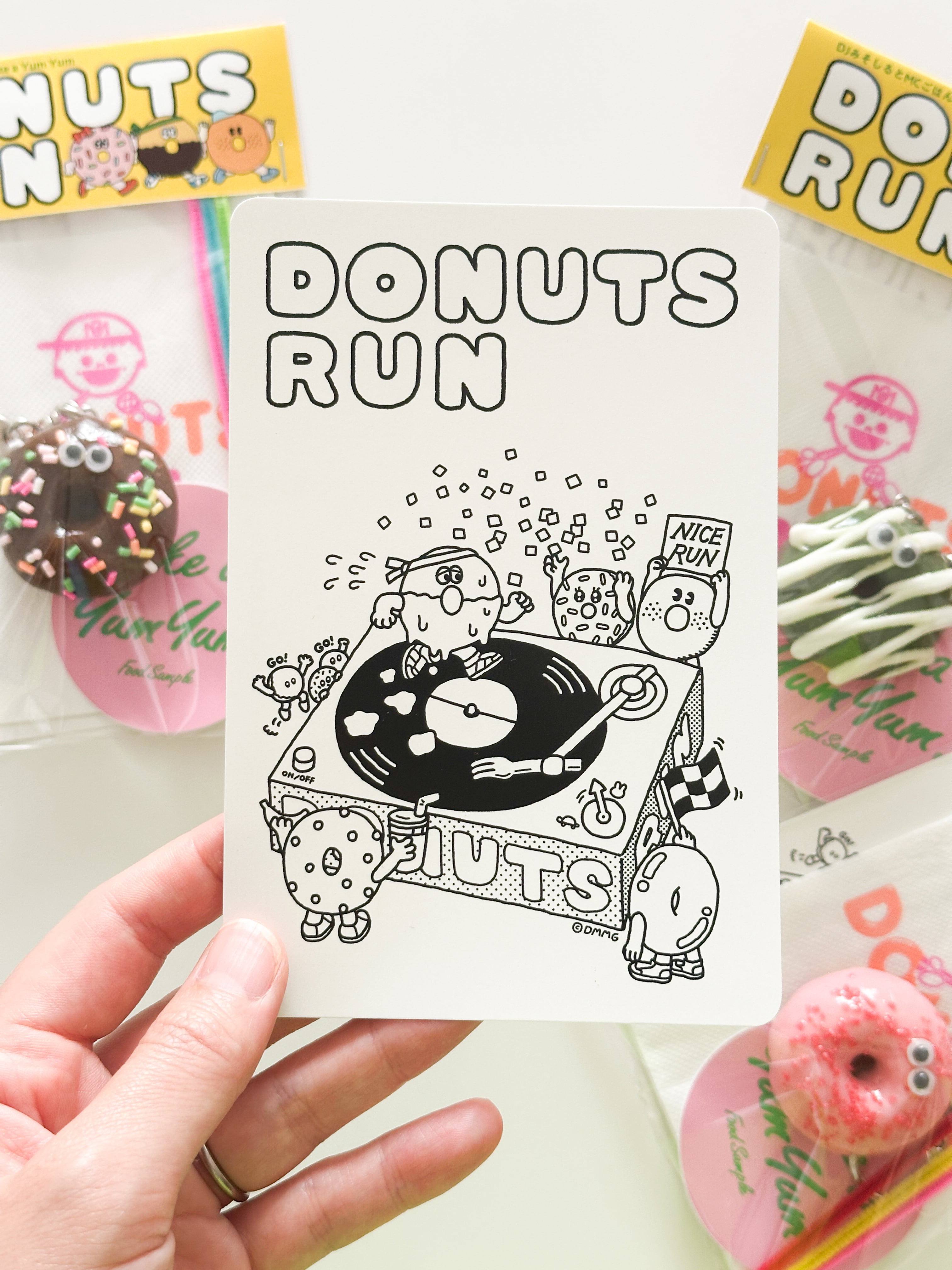 「DONUTS RUN」の配信リリースを記念して作ったキーホルダーです。つややかなチョコレートのコーティングにうっとり。くるくると動く目がチャームポイントです。直径は4cmです。